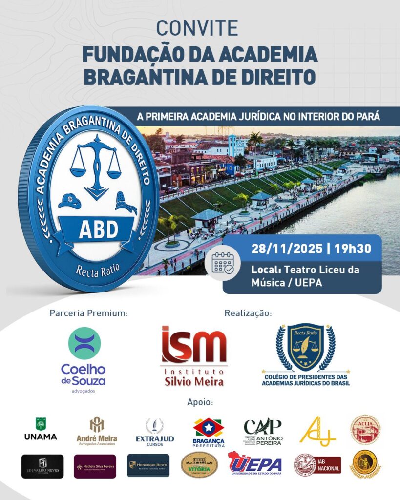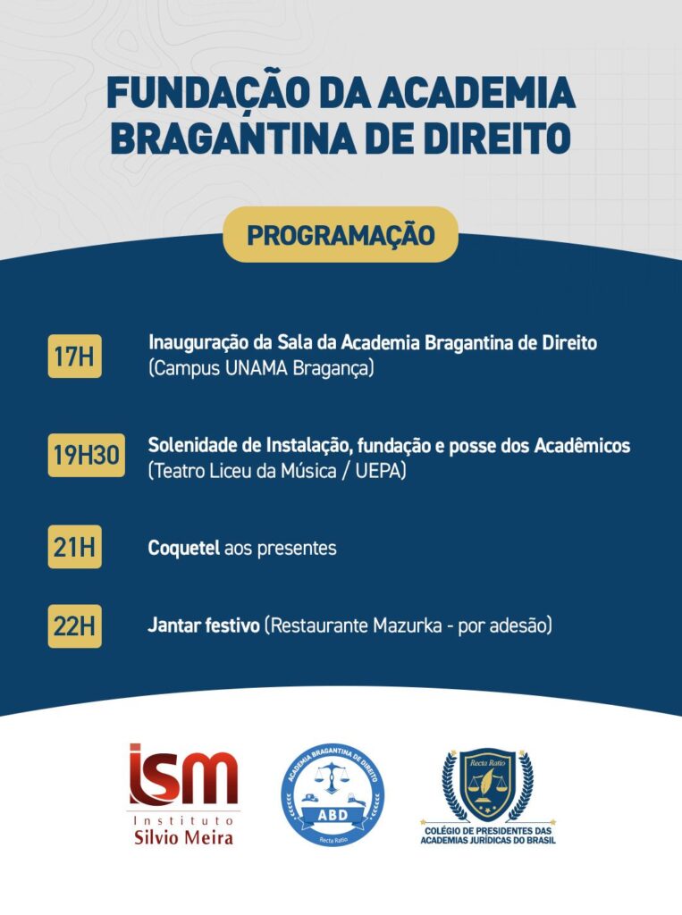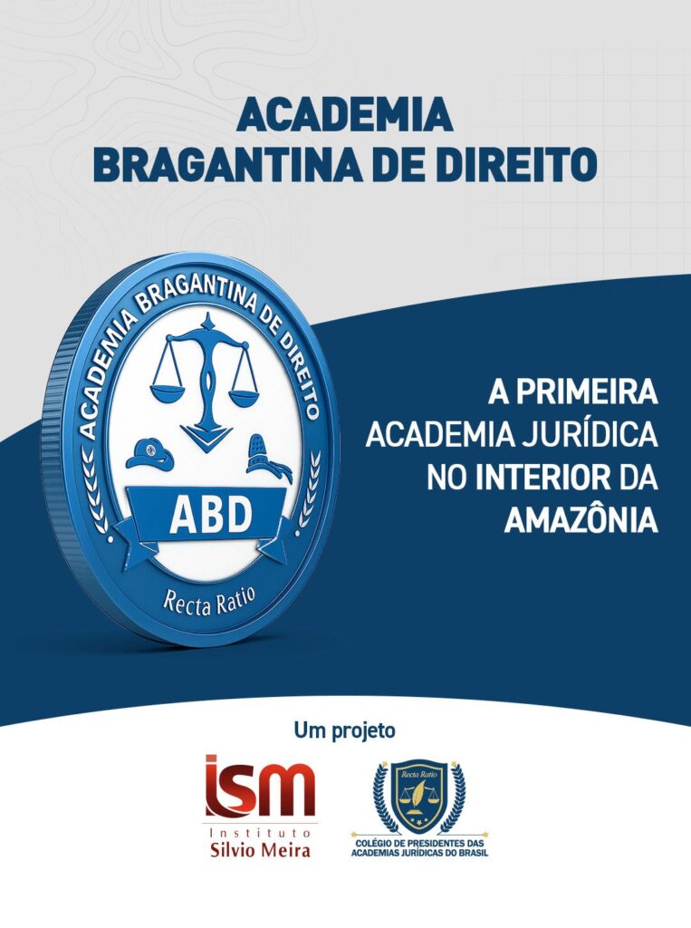 Através de um projeto de iniciativa do advogado e professor André Meira, presidente do Instituto Silvio Meira (ISM) e do Colégio de Presidentes das Academias Jurídicas do Brasil (COPAJUB), também titular da Academia Paraense de Letras Jurídicas (APLJ) e ex-presidente da Academia Brasileira de Direito, será fundada, no próximo dia 28 de novembro (sexta-feira), às 19h30, no Teatro Liceu da Música de Bragança, a Academia Bragantina de Direito (ABD), o primeiro silogeu jurídico no interior da Amazônia, abrangendo toda a Região histórica do Caeté.