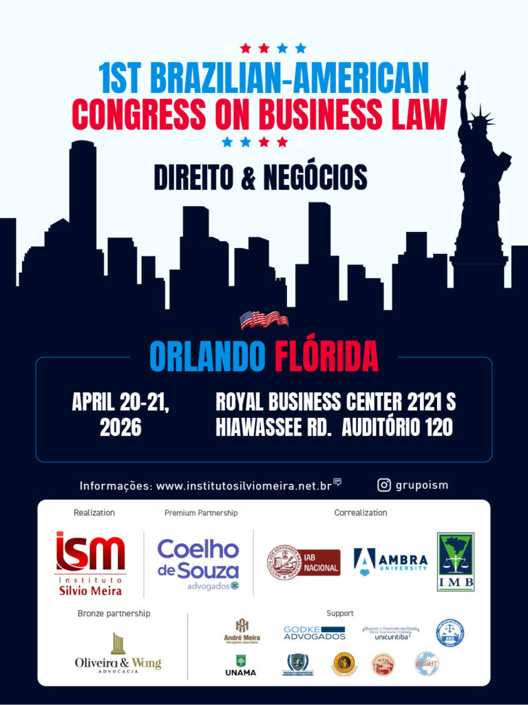 Abertas as inscrições ao 1ST BRAZILIAN-AMERICAN CONGRESS ON BUSINESS LAW, em Orlando, Florida, a ser realizado nos dias 20 e 21 de abril de 2026, no Auditório 120 do Royal Business Center, debatendo temas em Direito & Negócios com diversos juristas do direito empresarial do Brasil e do mundo. Imperdível.